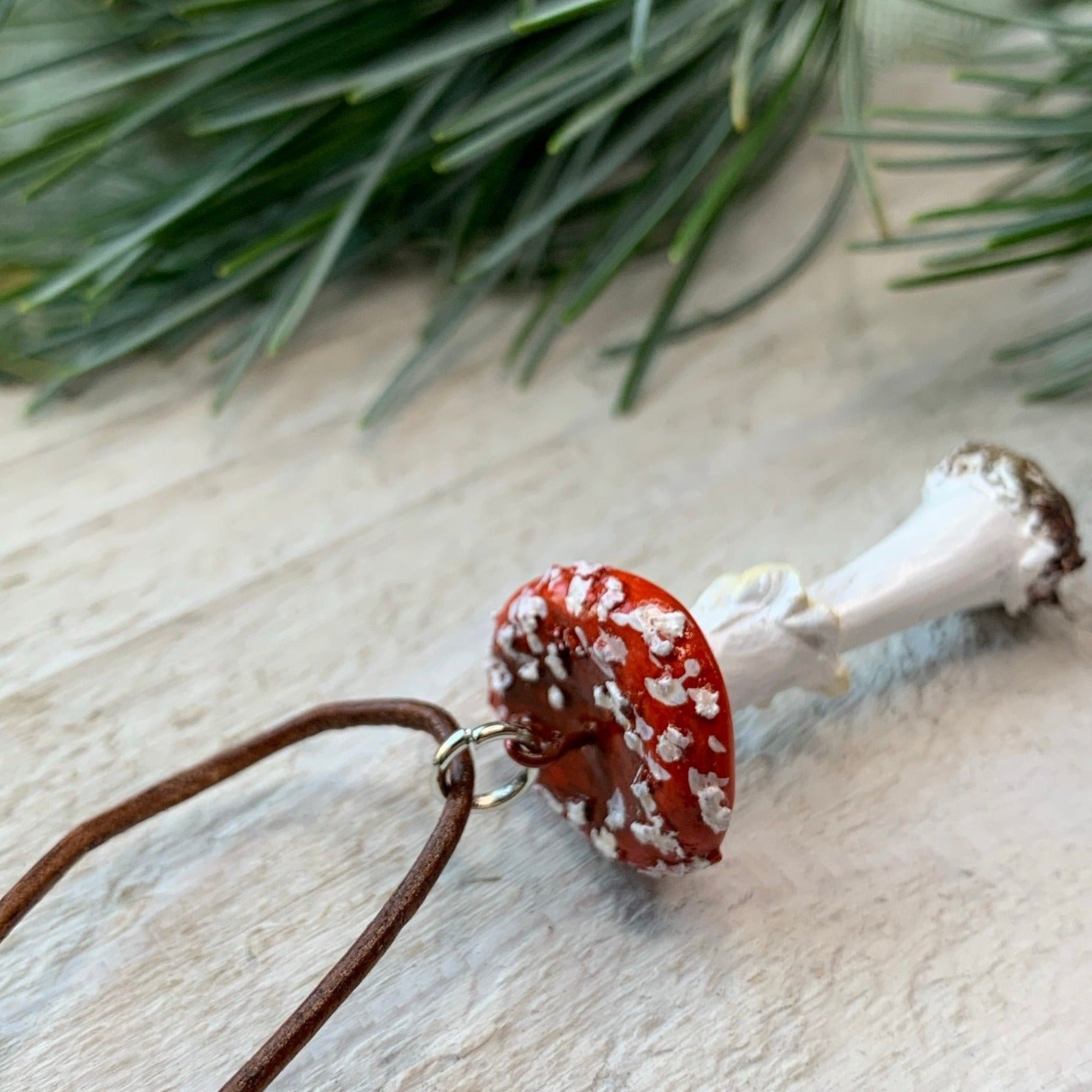 Hand sculpted and painted mushroom pendant on an adjustable leather cord that can adjust from 30 to 16 inches in length for the perfect fit. The mushroom pendant is about 1.5 inches in length. Each mushroom is unique as each piece is shaped by hand and has it's own natural characteristics just like the ones in nature. The pictured pendant may not be the exact mushroom you receive but they are all made with consistency in mind. The pendants are finished off with a UV resistant gloss spray that will help prolong the life of the piece and it's vibrant colors from sunlight and normal wear. Made in Sequim, WA.