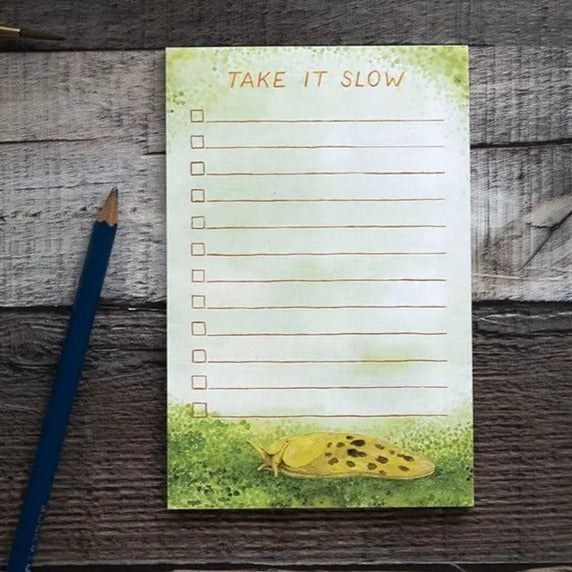 A punny notepad that will remind you to take things slow, featuring a full-color watercolor illustration of a banana slug and hand lettered text reading Take It Slow. 4" x 6", 50 sheets. Made in USA, recycled paper.