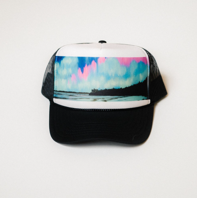 Adjustable mesh back trucker hat featuring artwork by local artist, Amy Duffy, of the Northern Lights over the Salish Sea