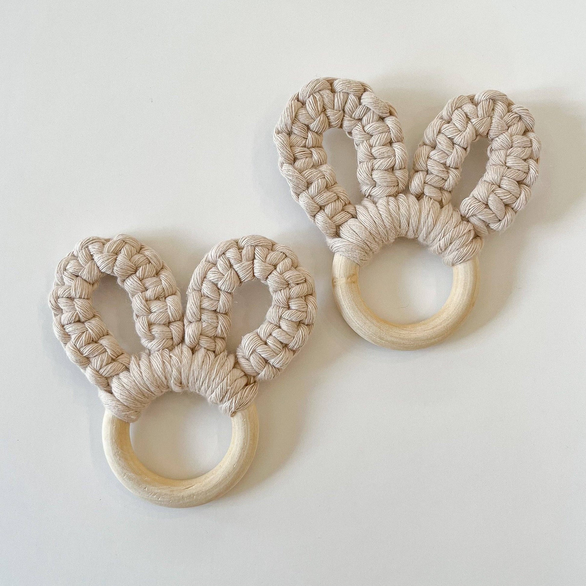 Our bunny creation can be used as a baby teether or a napkin ring (perfect for Easter gatherings). Your baby will love our bunny teether! It's handcrafted with a wooden ring and recycled cotton cord. This teether is perfect for an Easter basket, Mother's Day gift, baby shower gift, stocking stuffer, baby photography prop, and more!