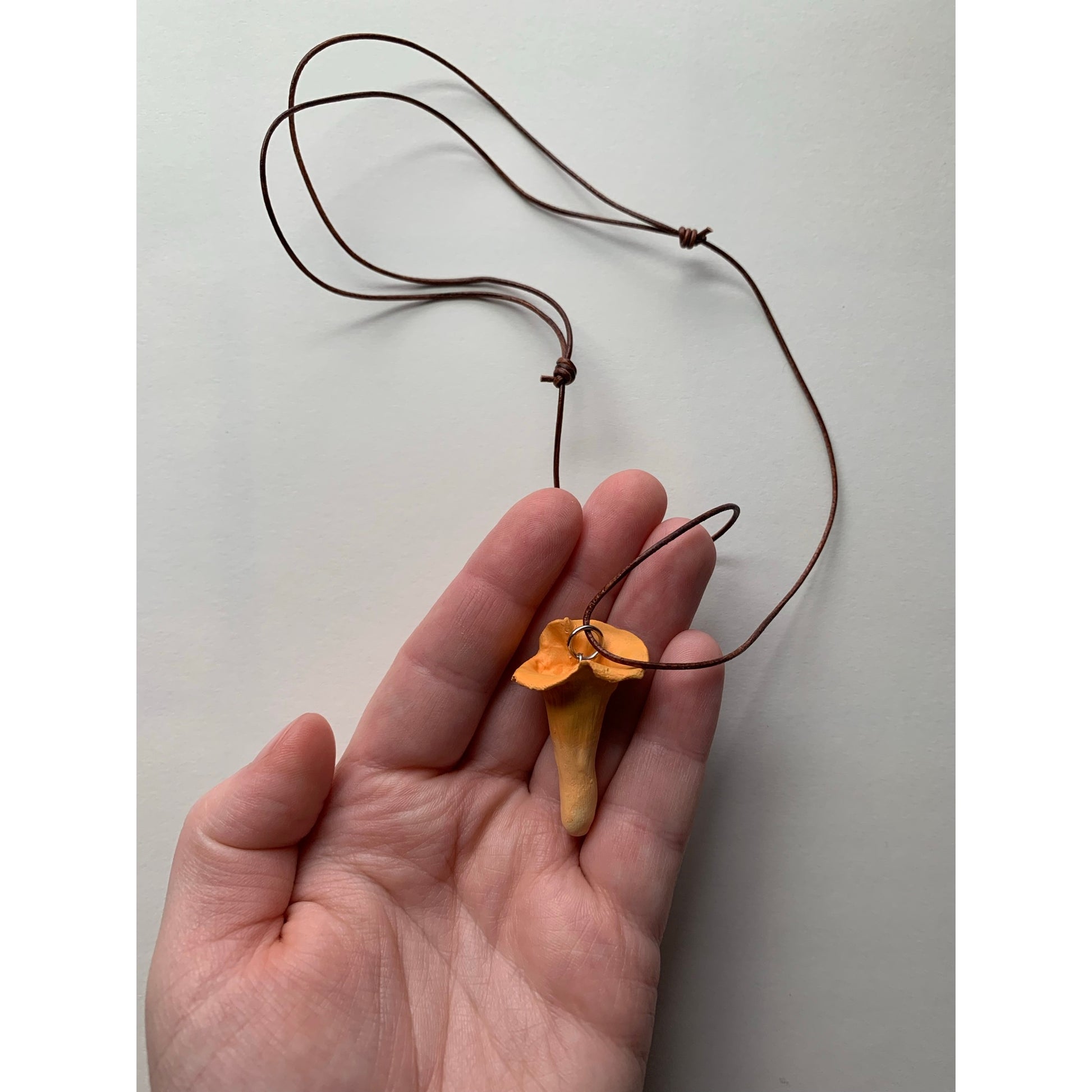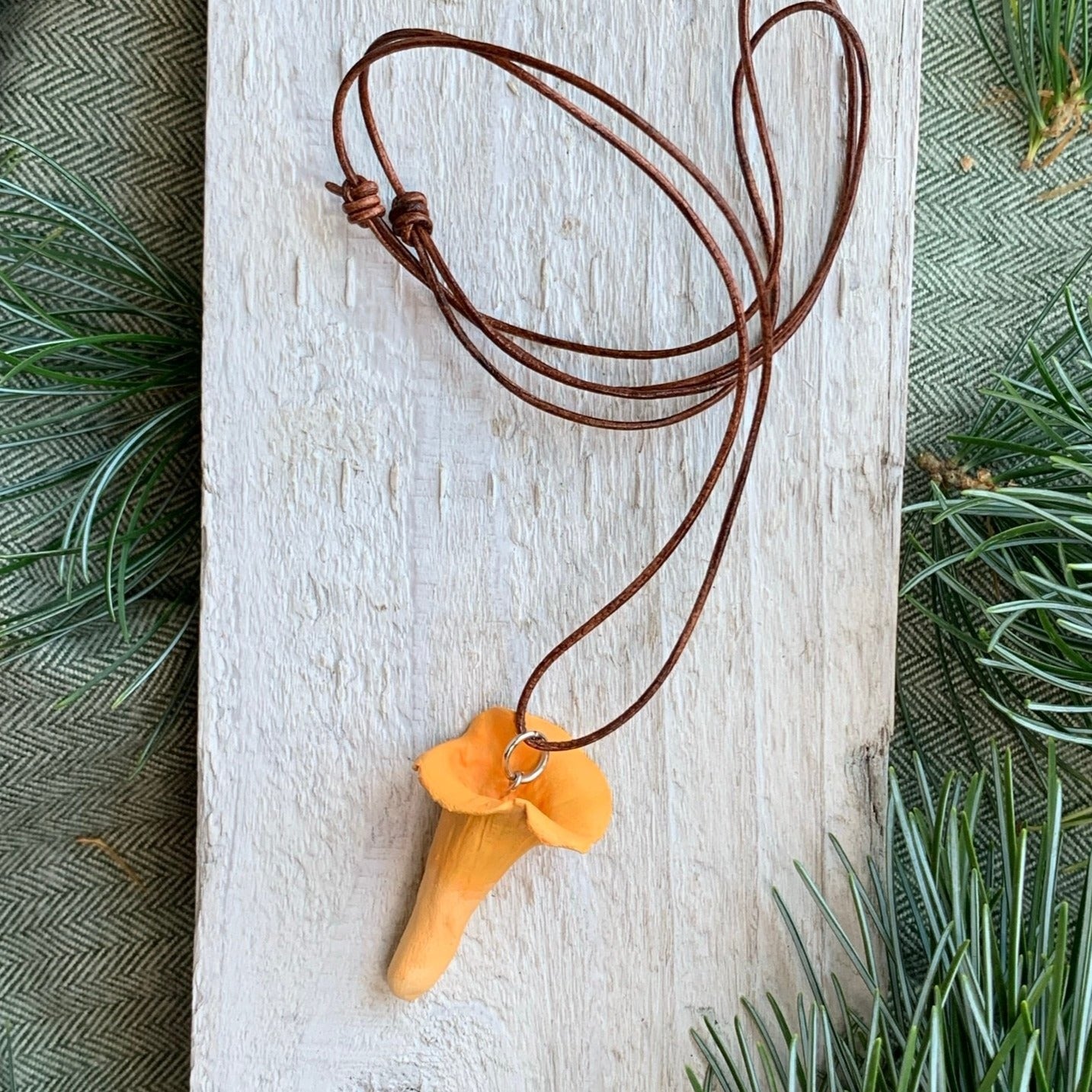 Hand sculpted and painted mushroom pendant on an adjustable leather cord that can adjust from 30 to 16 inches in length for the perfect fit. The mushroom pendant is about 1.5 inches in length. Each mushroom is unique as each piece is shaped by hand and has it's own natural characteristics just like the ones in nature. The pictured pendant may not be the exact mushroom you receive but they are all made with consistency in mind. The pendants are finished off with a UV resistant gloss spray that will help prolong the life of the piece and it's vibrant colors from sunlight and normal wear. Made in Sequim, WA.