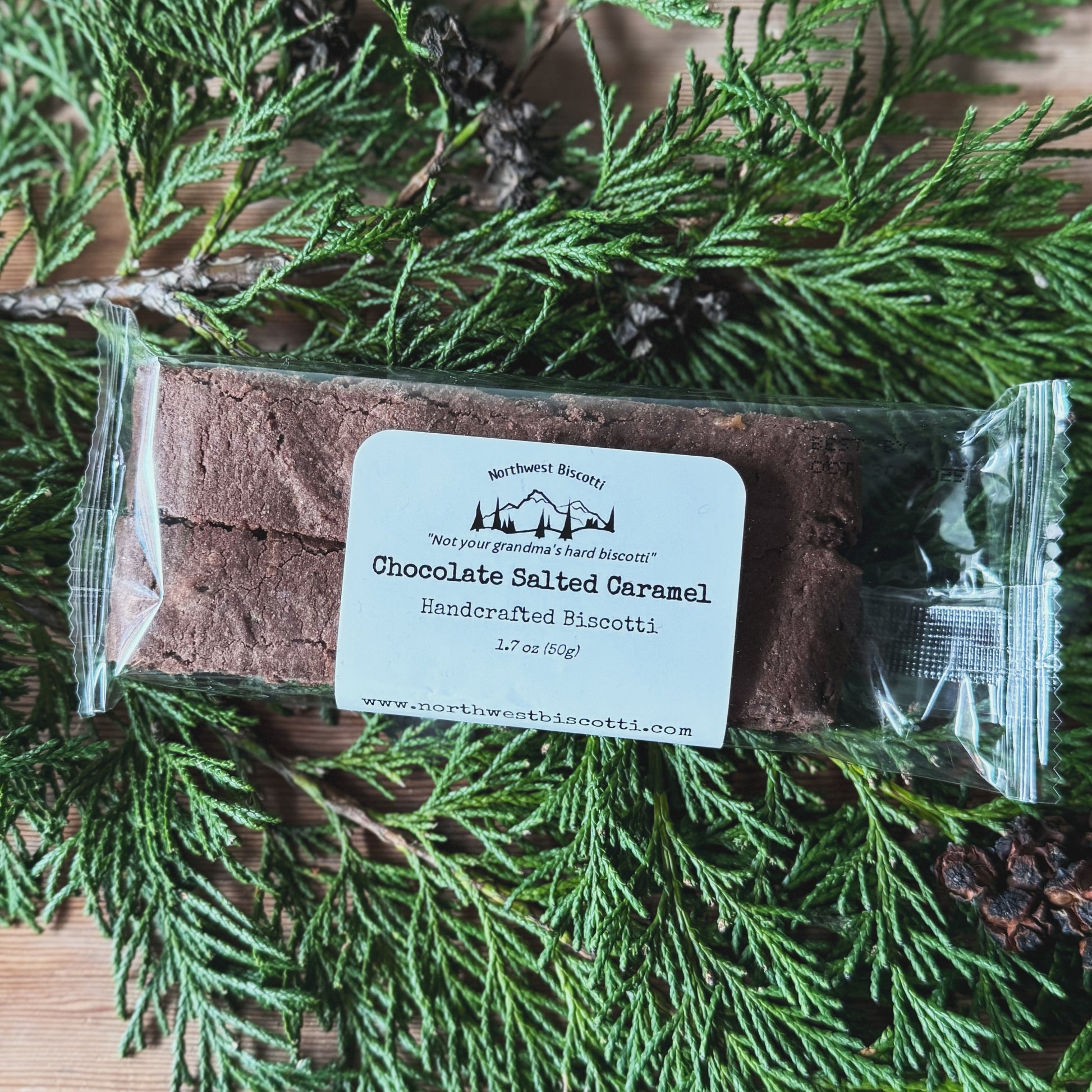 Two pieces of caramel flavored chocolate biscotti with caramel bits and sea salt. 12 month shelf life.