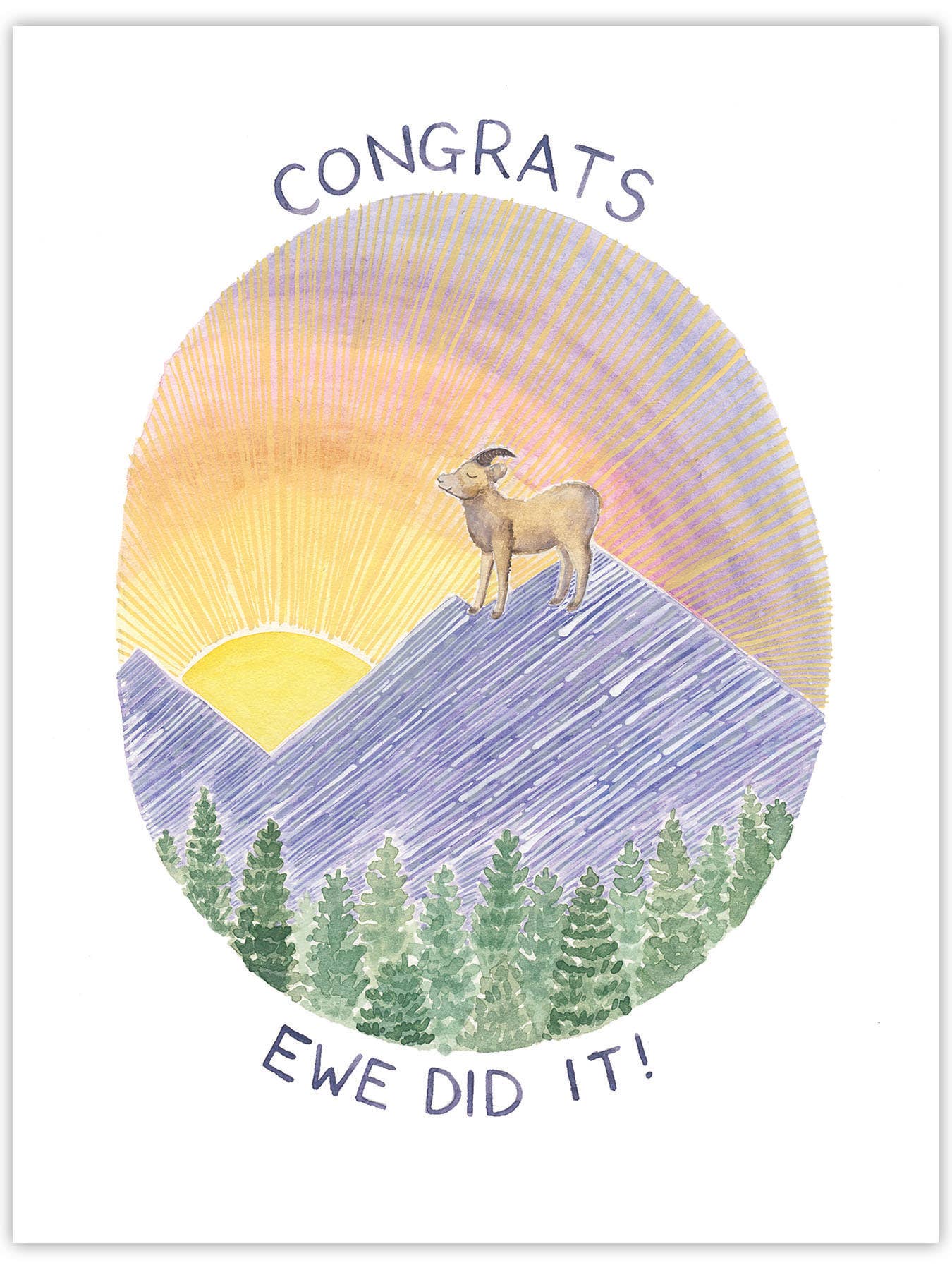 This congratulations card features my full-color illustration of a bighorn sheep ewe standing proud on the Rocky Mountains, with the message, "Congrats, ewe did it!" Celebrate an adventurous, free-spirited graduate ready to take on the world with this watercolor illustration.