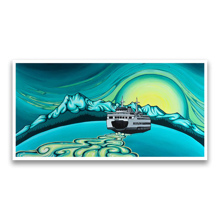 "Midnight Crossing" symbolizes the beginning of a new adventure. It features crossing over the Puget Sound from Seattle to the Olympic Peninsula under a moonlit sky. Measures 16"x 8".