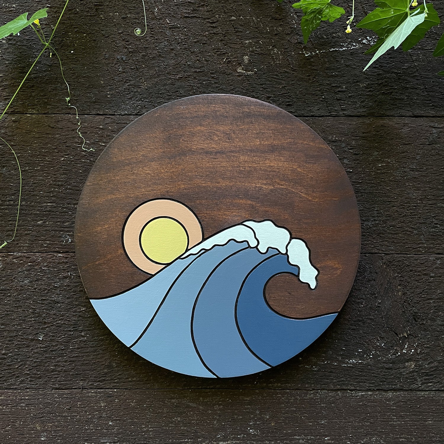 8" round view of a wave in cool blue tones. Sawtooth hanger on the back.