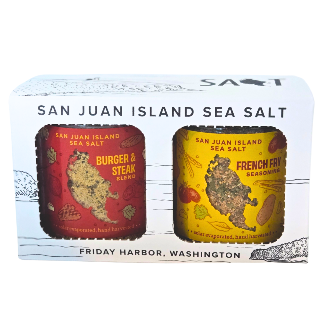 A two-pack of our blends that go with anything related to meat-and-potatoes! One full-size jar of our Burger & Steak Blend and one full-size jar of French Fry Seasoning. We recommend it for burgers and fries (of course!) but also for your next fancy steak night. Comes in our classic two-pack box with our story on the back.