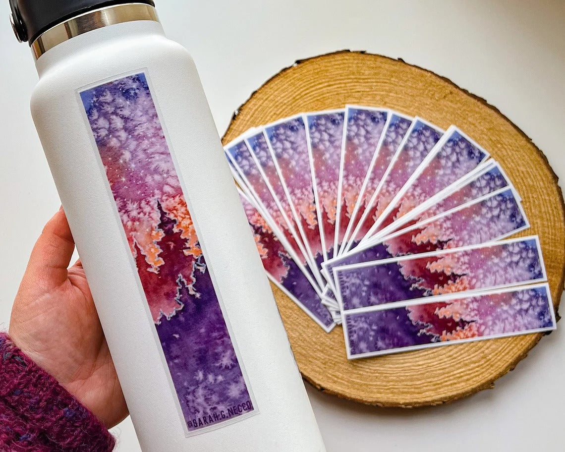 Beautiful and vibrant clear vinyl 1.5" x 7" die-cut sticker with a satin finish. I call this a “tallscape” sticker because unlike my other wide landscape stickers, this sticker is a tall and narrow snapshot of a landscape- almost like a little portal to another world. This sticker is made from one of my original watercolor paintings.