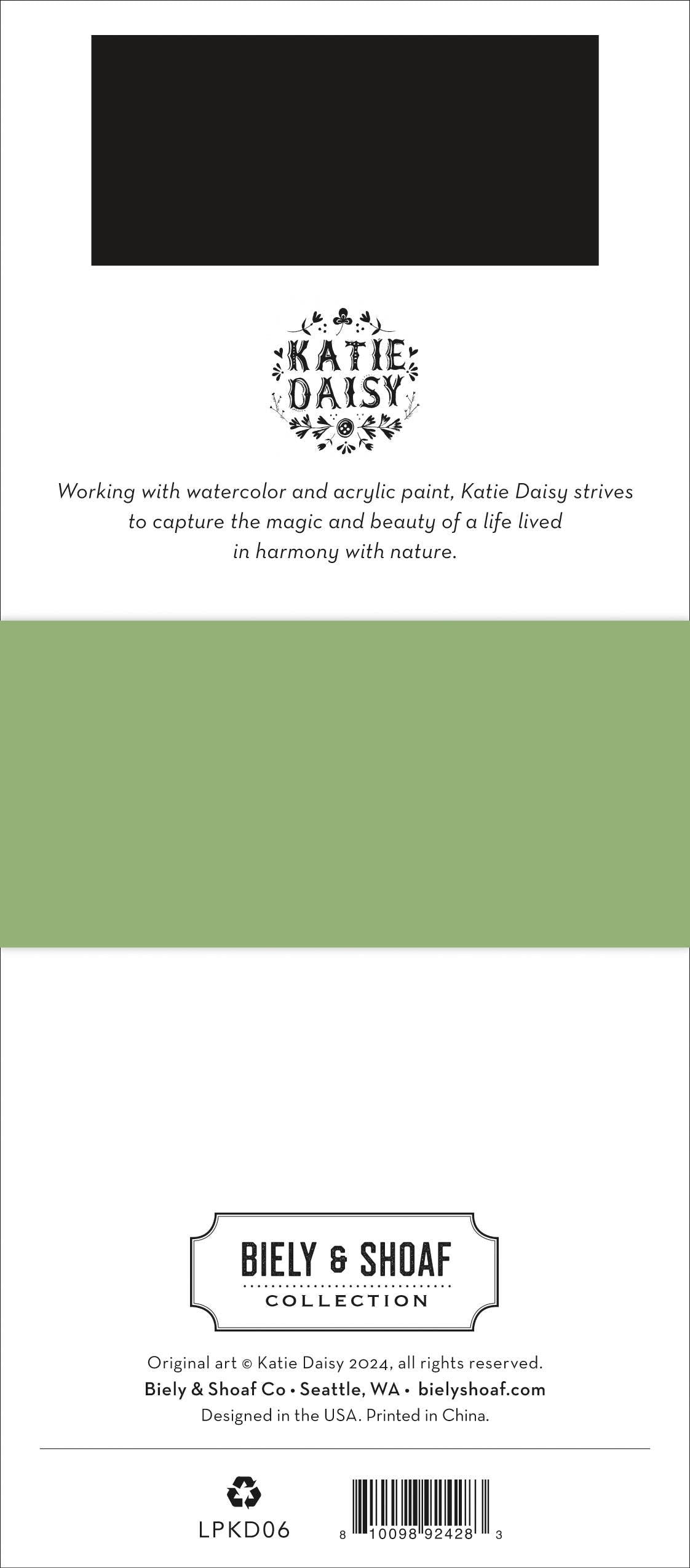 About The Artist: Working in watercolor and acrylic paint, Katie Daisy strives to capture the magic and beauty of a life lived in harmony with nature.