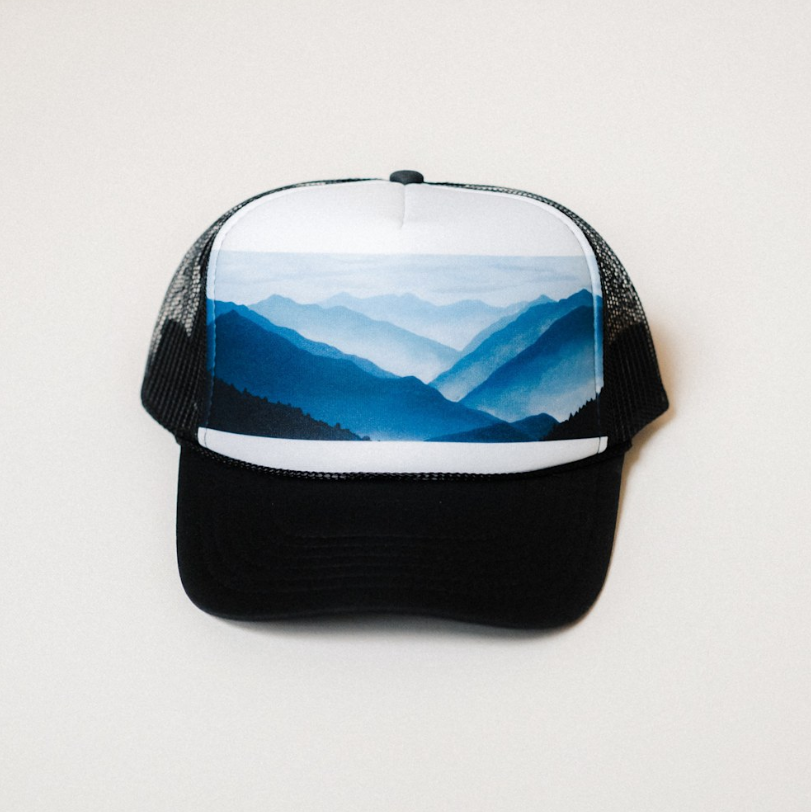 Adjustable mesh back trucker hat featuring artwork by local artist, Amy Duffy, of the Hurricane Ridge mountains.
