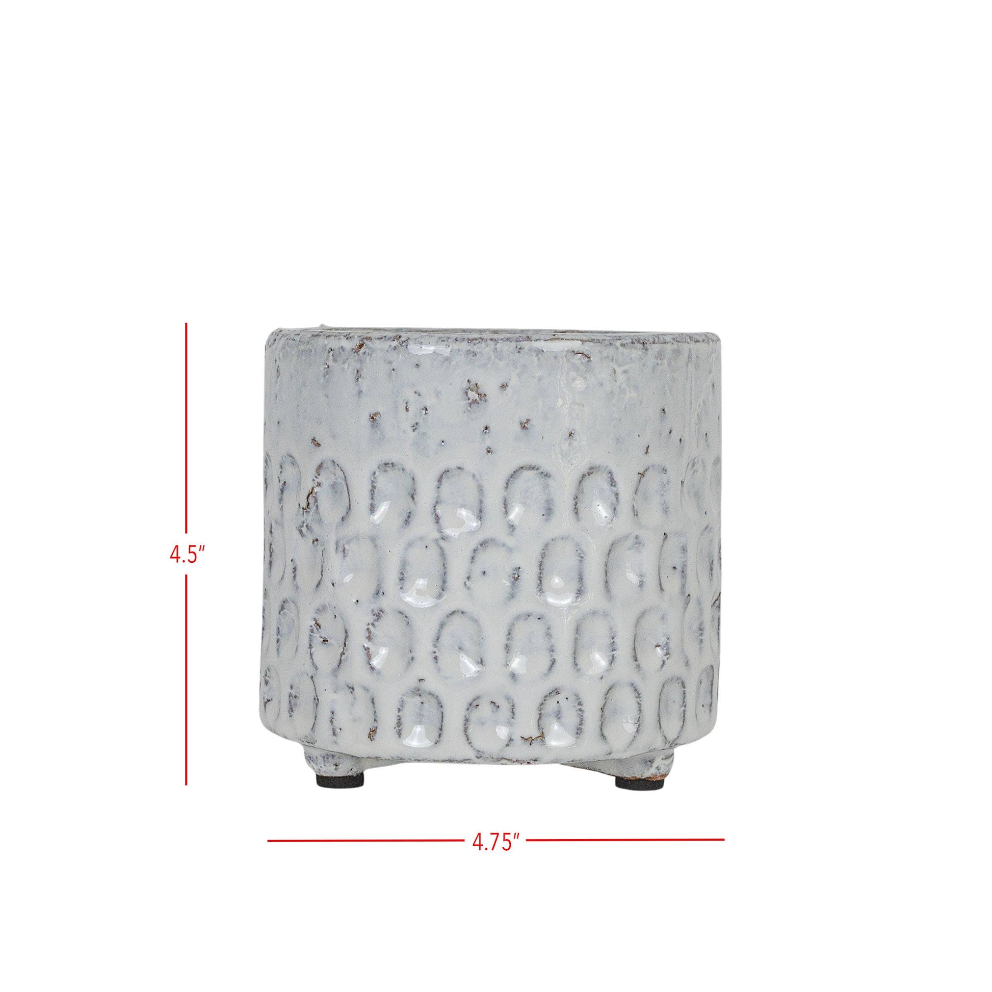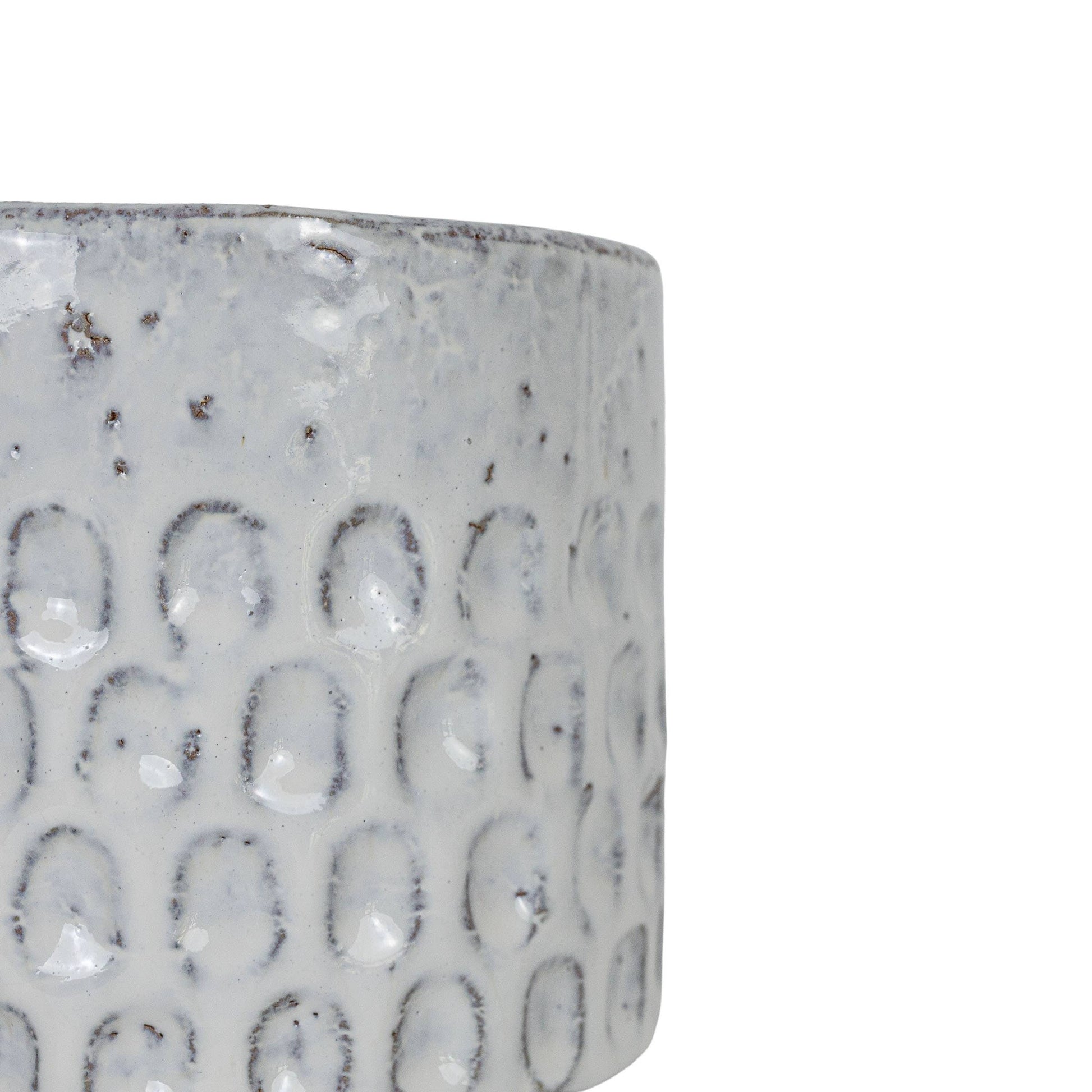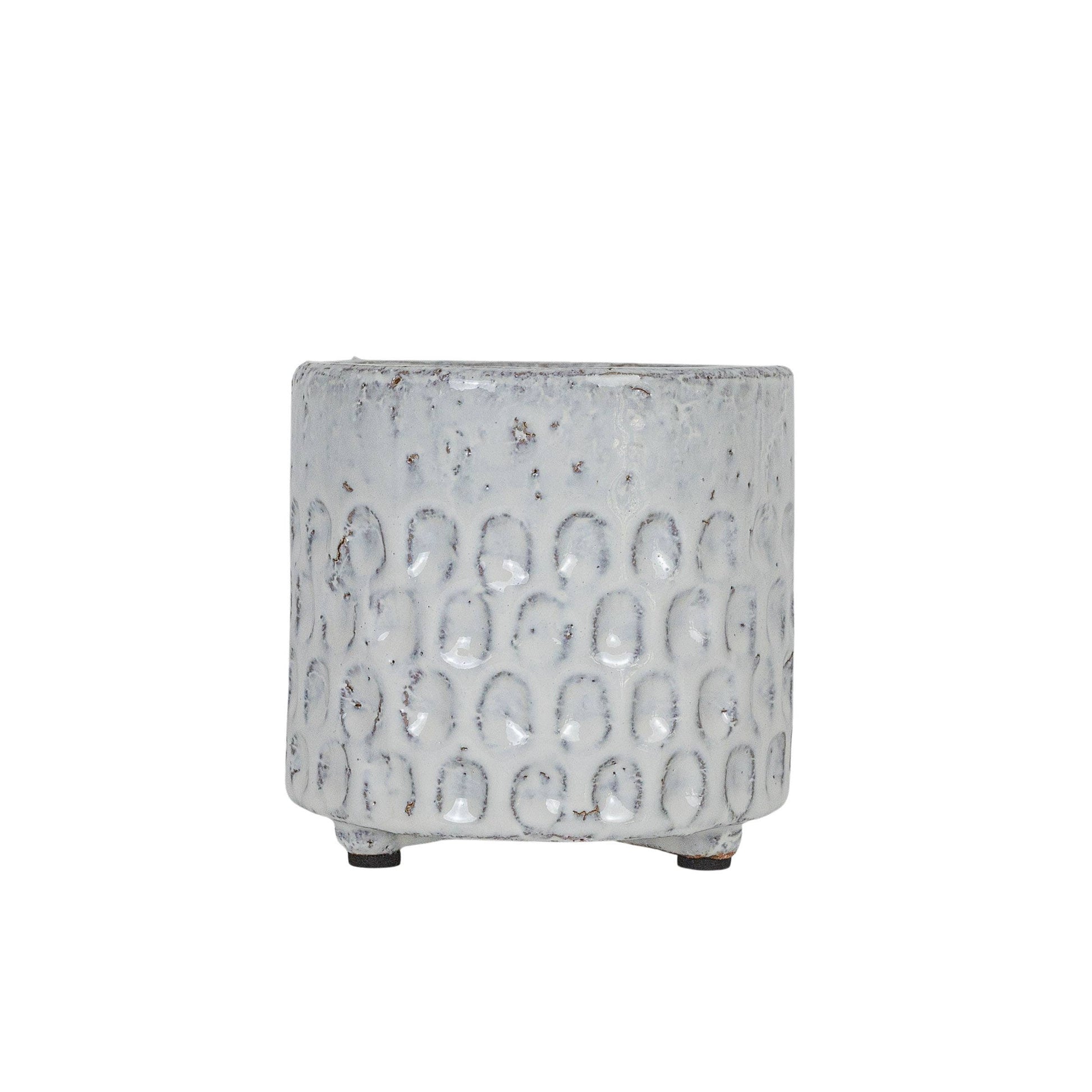 It's all about the textural details with this planter. Hand glazed, the glossy white milk glaze flows over the natural terracotta allowing the textural clay elements to shine through. Pressed indents debossed at the base of the pot add dimension and interest to this boho style planter.