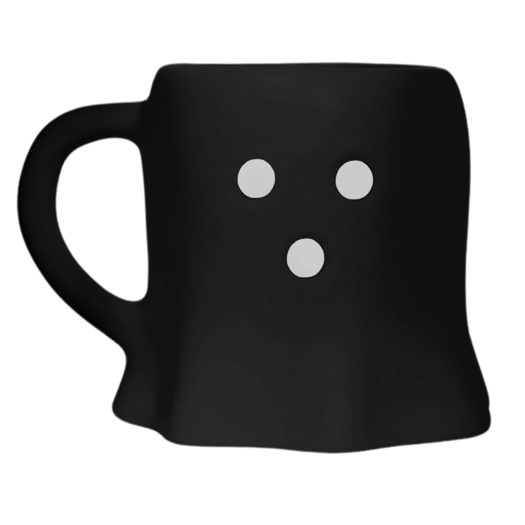 DETAILS: • 12oz Ceramic Style Mug • Size: 3.5" x 4" (5.5" w/ handle) • Black Color with Ghost Face Design • Designed in the USA • Microwave and Dishwasher Safe • Wash Before Use and Avoid Abrasive Cloths When Cleaning • Use Caution When Removing From Microwave