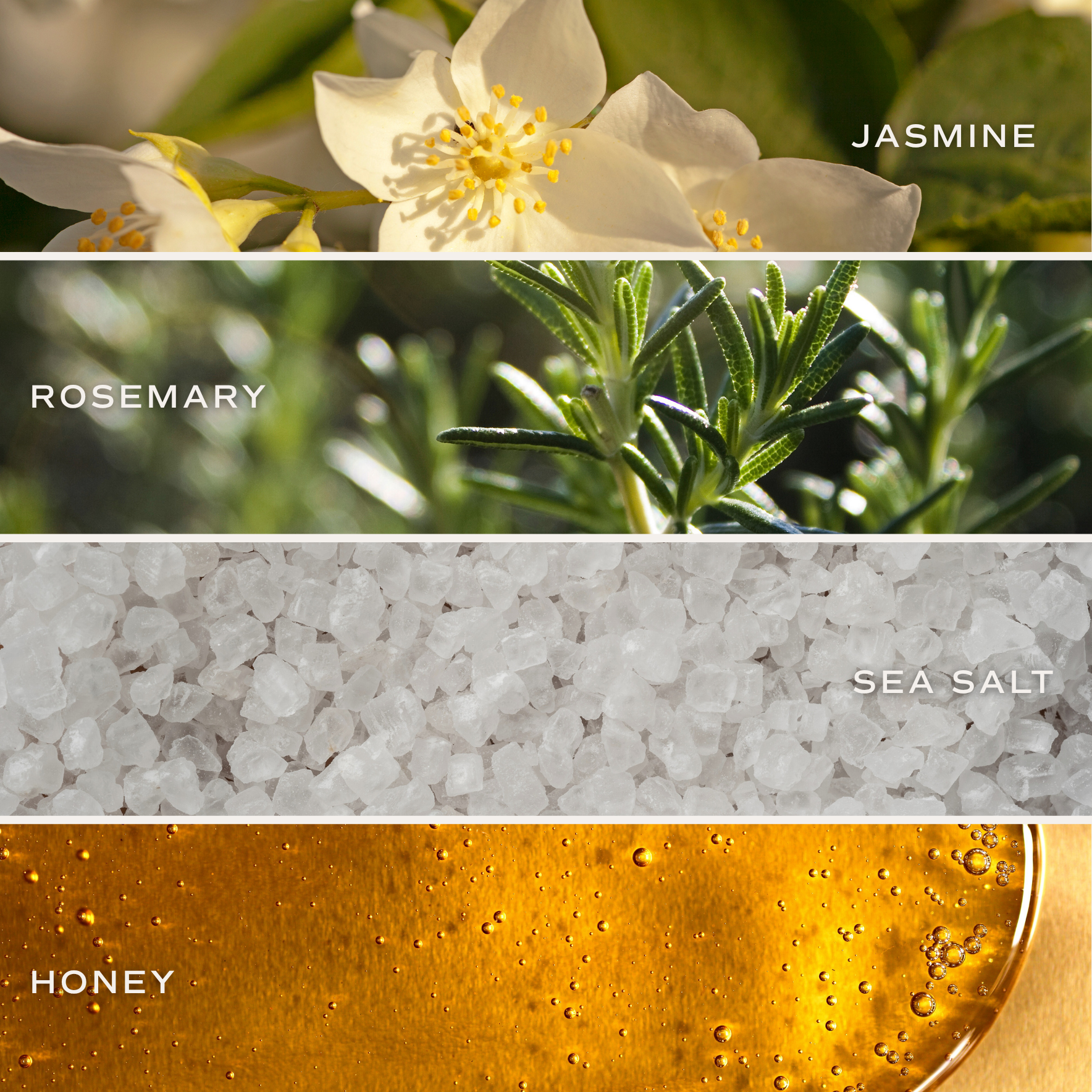 • Top: Jasmine, Rosemary • Middle: Sea Salt • Base: Honey Infused with natural essential oils: citrus limon (lemon) peel, eugenia caryophyllus (clove) leaf, pelargonium graveolens flower, rosmarinus officinalis (rosemary) leaf