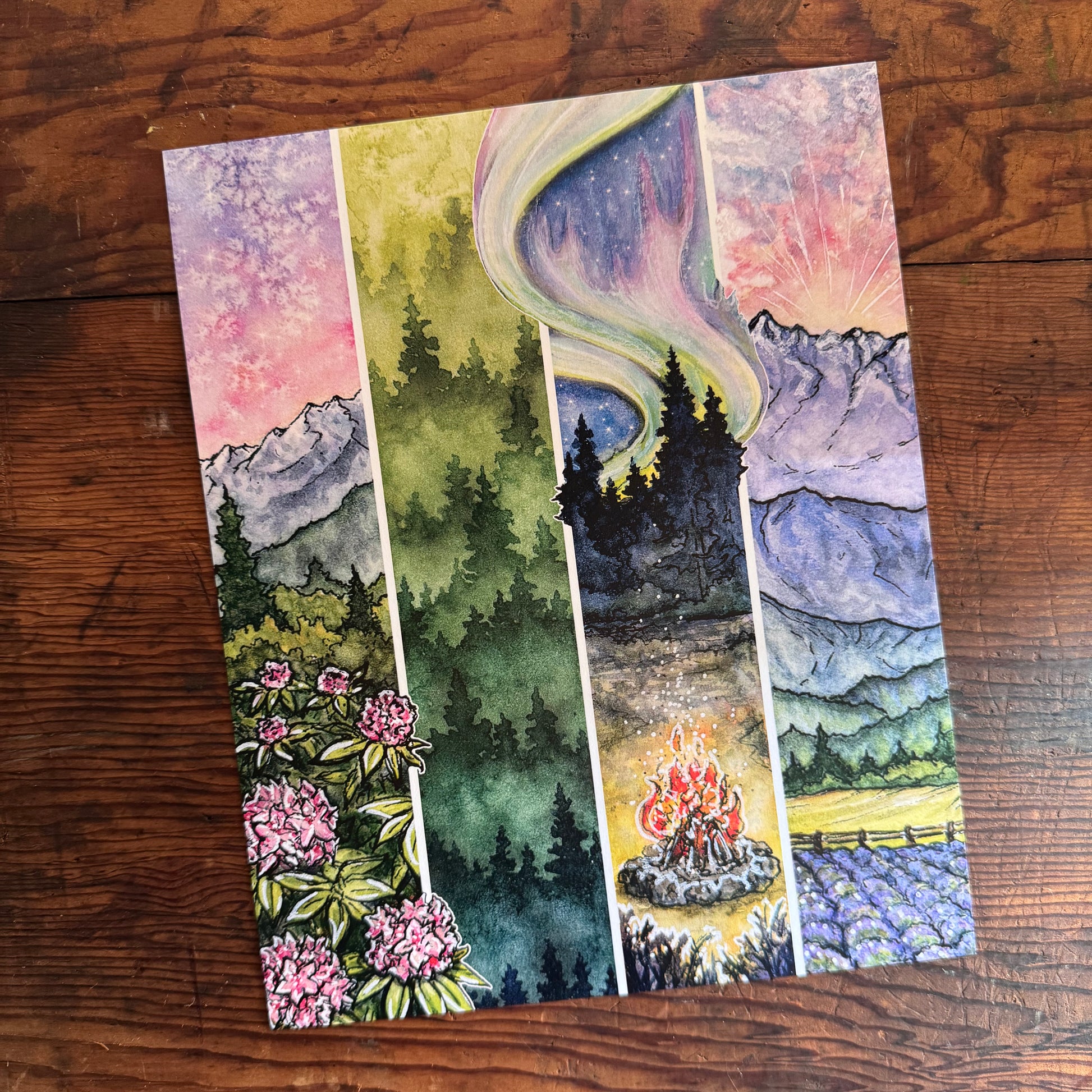 This beautiful and vibrant watercolor mountain & forest scene is printed on thick cardstock. 8"x10".