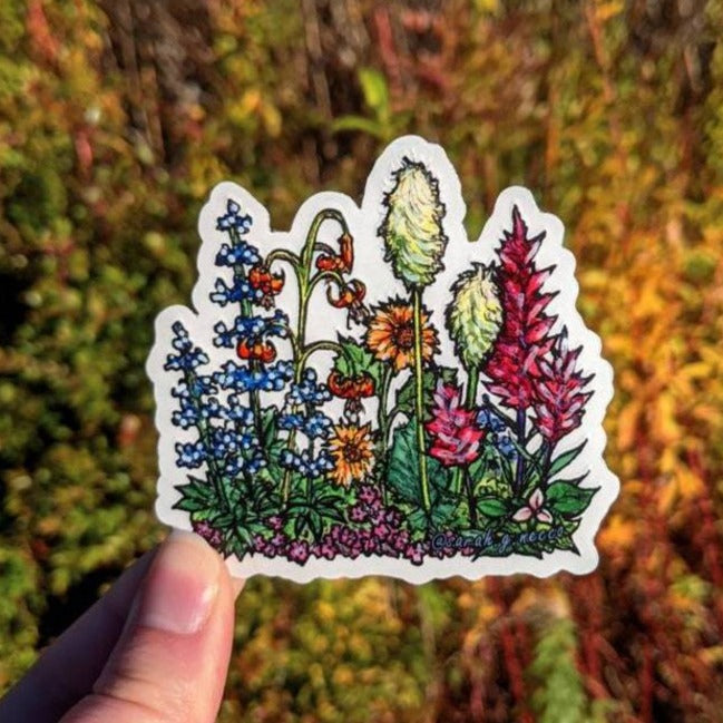 This watercolor painting was inspired by the wildflowers that can be found across the Pacific Northwest. Some included on this sticker are: lupine, lilly, phlox, trillium, paintbrush, and sunflower.