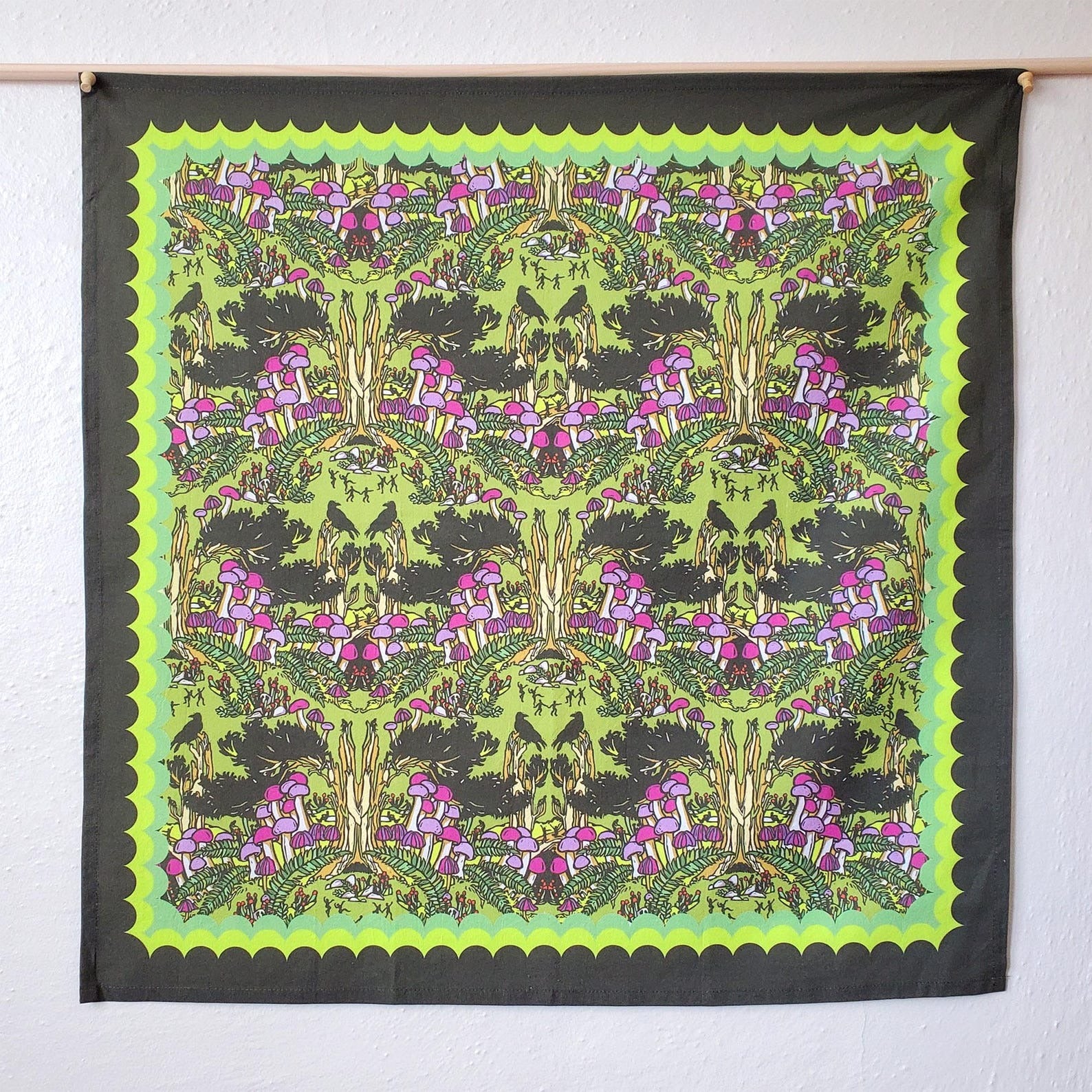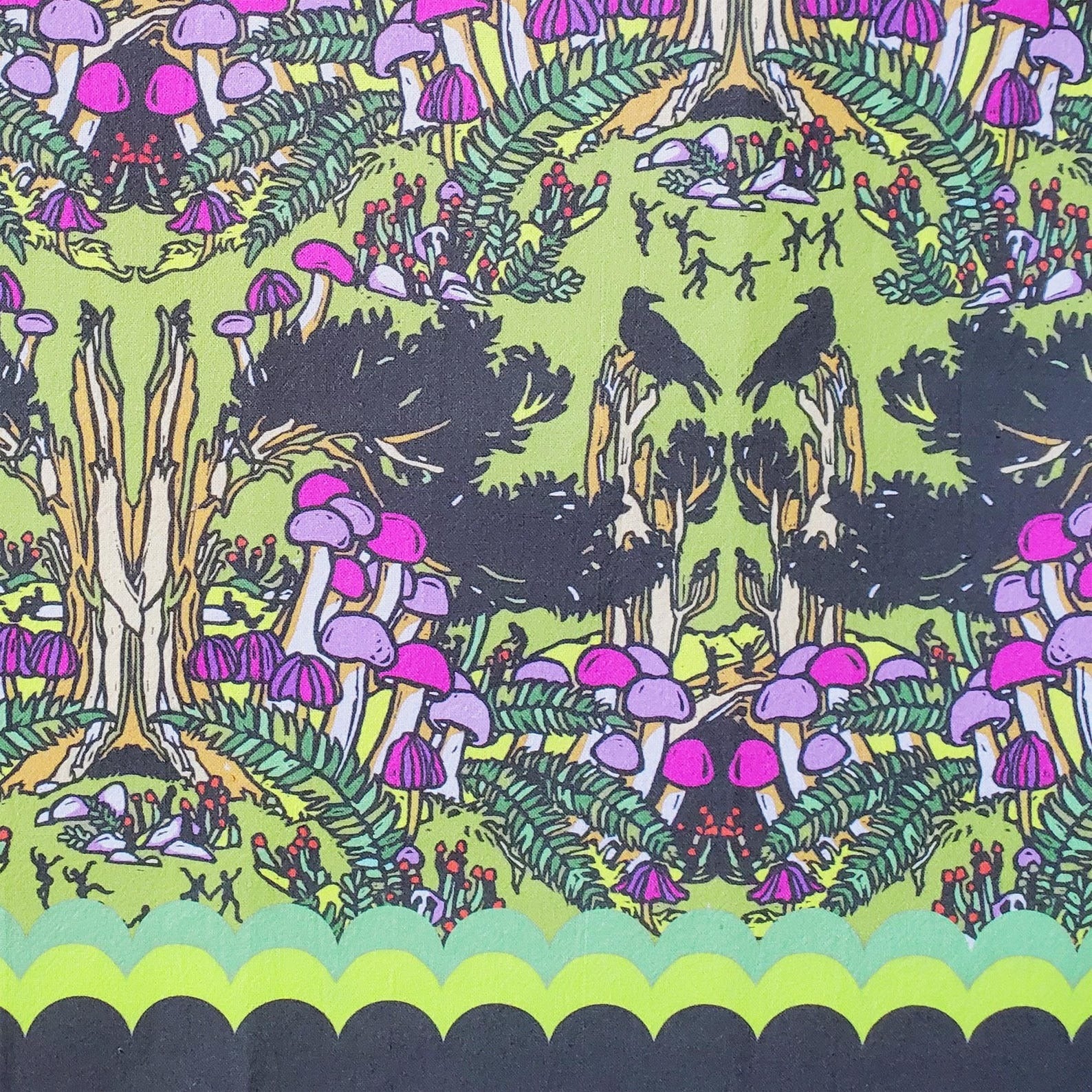 This lush green mushroom mirrored pattern is designed from original linocut artwork, making this a truly unique design pattern and gift item. This is a digitally printed design that can withstand many washings, and the cotton fabric is soft and absorbent.
