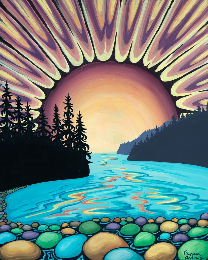 Sunset at the lake. Made in USA. 9"x12". Bamboo paper. Original art by Gianna Andrews.