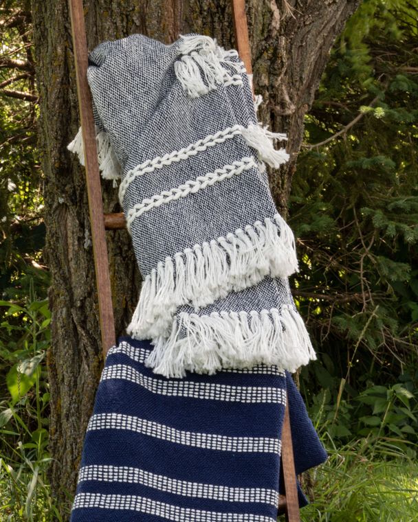 Harriet is the perfect cozy casual throw. White tassels and thick, braided yarns sit upon a two-tone woven blue and white base. Cozy up indoors or out with soft, high quality, UV stabilized yarns. Machine Wash Cold, Gentle Cycle, Do not Bleach, Line Dry.