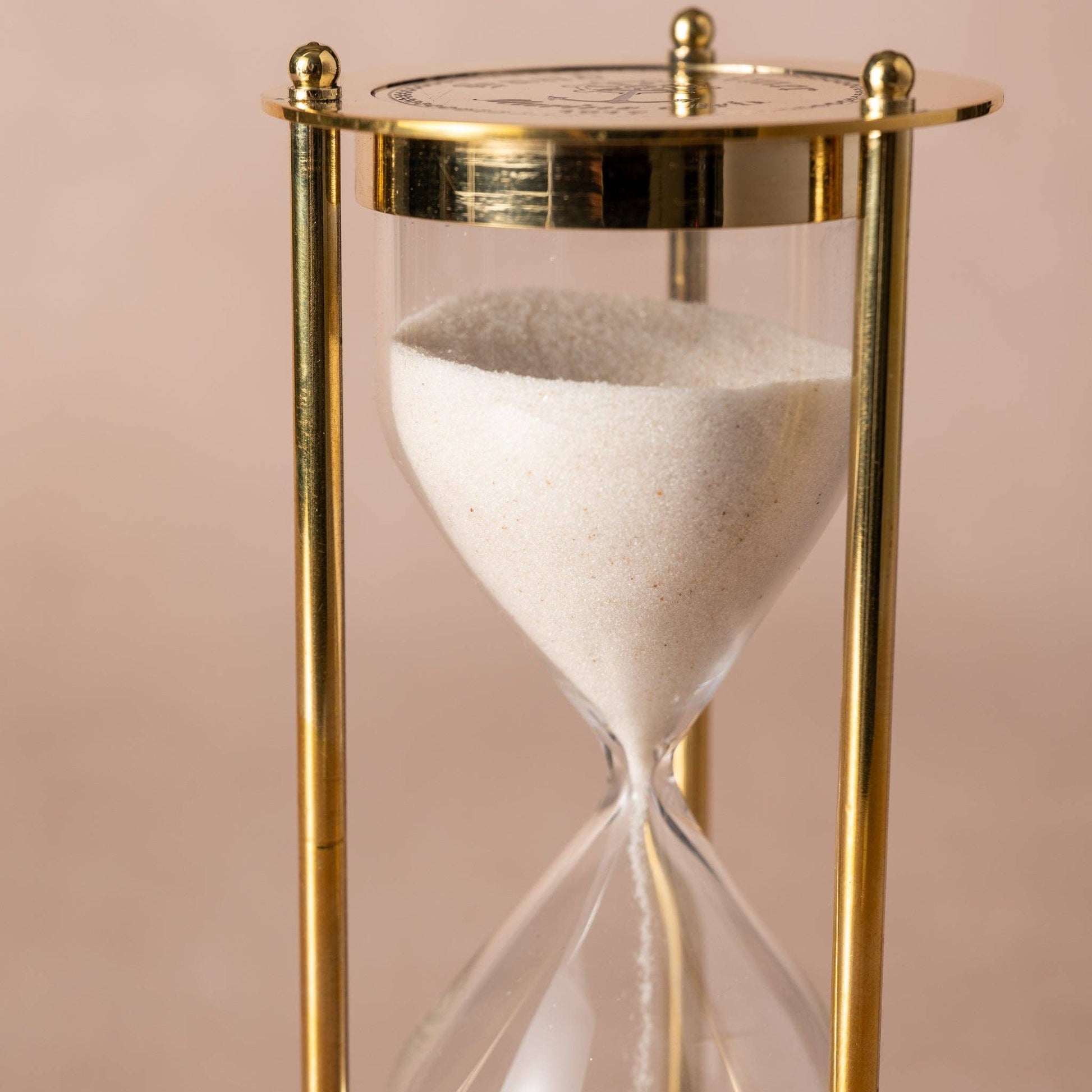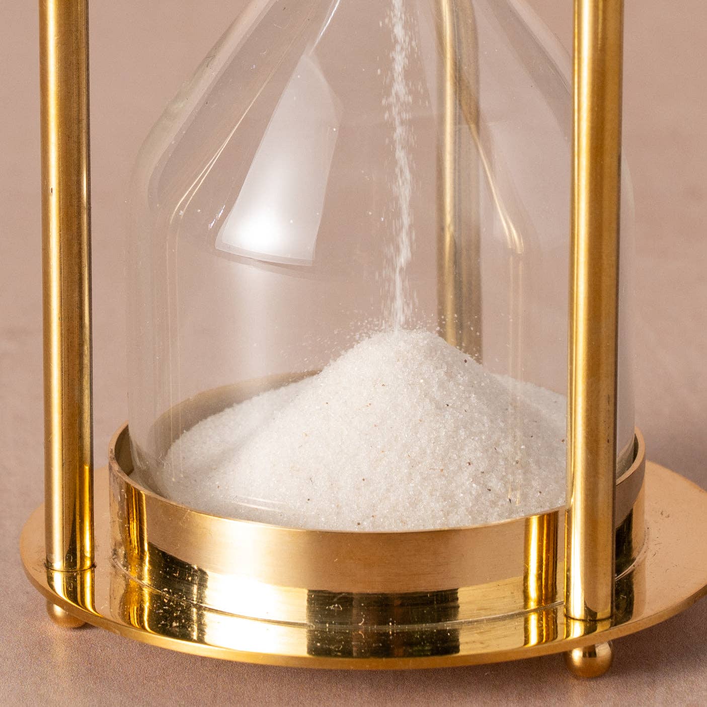 This polished brass hourglass features three gleaming rods connecting the engraved top and bottom plates Each rod is capped with decorative finials that double as graceful feet. Inside, fine white sand flows steadily through the glass chamber creating an age-old symbol of balance, patience and the passage of time. Sand flow measures one hour. A Ten Thousand Villages Exclusive handcrafted by the artisans of Noah's Ark International Exports in Moradabad, India an organization that focuses on empowering low-income artisans and preserving their cultural traditions through ethical production practices.