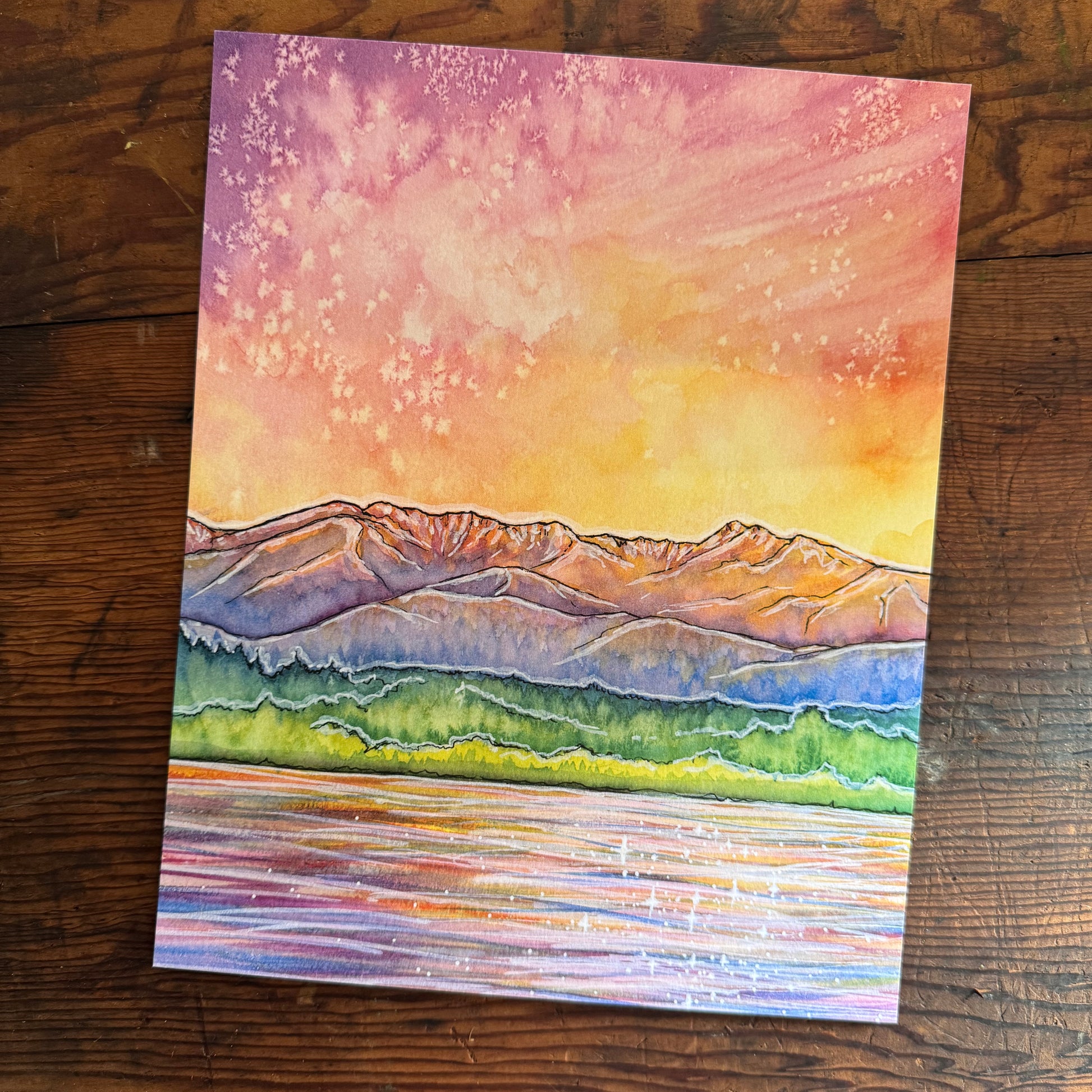 This beautiful and vibrant watercolor scene is inspired by the view of the Olympic Mountain Range from Ediz Hook in Port Angeles. Printed on thick cardstock. 8"x10".