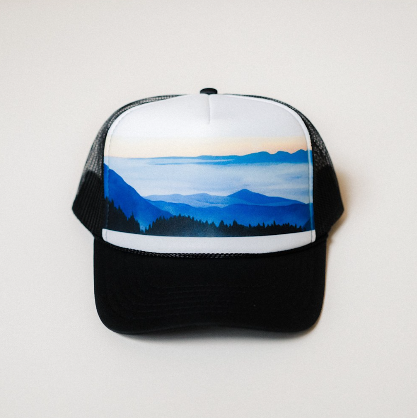 Adjustable mesh back trucker hat featuring artwork by local artist, Amy Duffy, of Hurricane Ridge looking towards the Salish Sea.