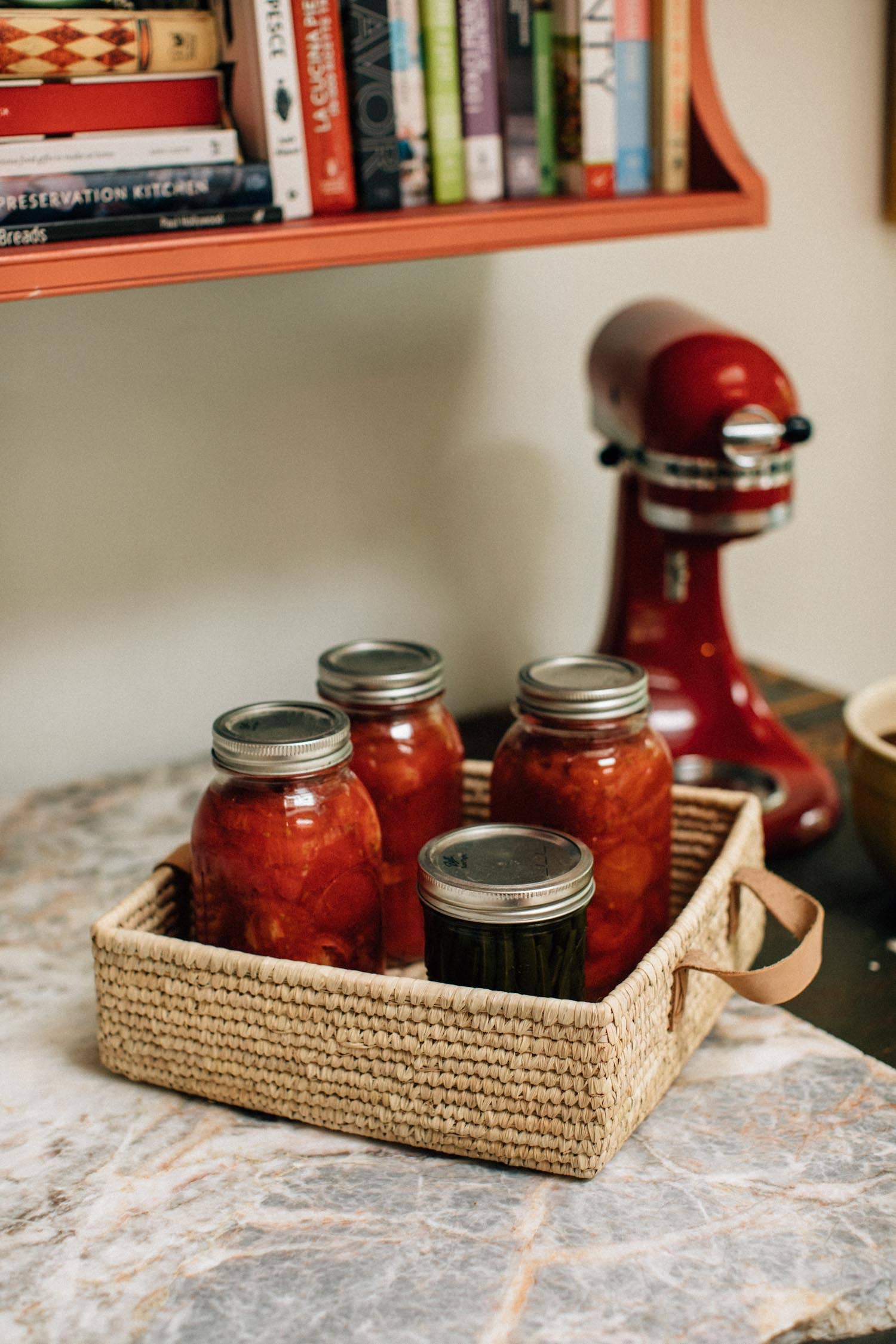 Two tan leather handles attached to the sides of the basket (one on each side)