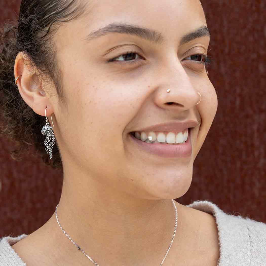 Sterling Silver Jellyfish Dangle Earrings. The languorous movements, smooth and silky spiraling tentacles, bobbing and parachuting top: the jellyfish. An interesting and wondrous creature, the jellyfish mainly lives in warm seas using the currents and winds for its movement. Though extremely delicate and soft, this creature can be a deadly encounter with its stinging and poisonous tentacle barbs. Using the jelly as an example, we can learn to find the correct fluidity and strength in our own lives. Gentle and supple to life's tumultuous currents, yet electrifying and powerful in times of need. Add these beautifully detailed earrings to any collection for daily reminders of the loveliness of life.