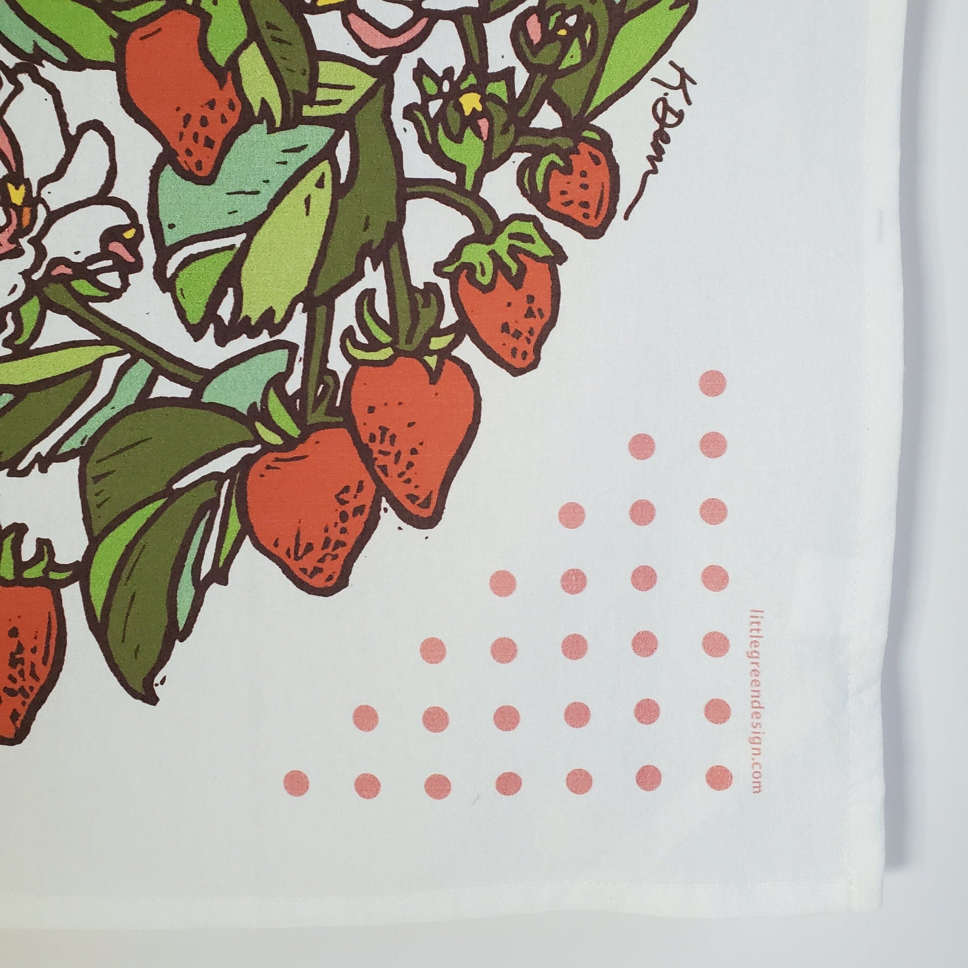 The bright strawberry designed comes from an original linocut artwork, making this a truly unique design pattern and gift item. This is a digitally printed design that can withstand many washings and the cotton fabric is soft an absorbent.