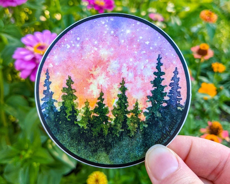 Sunset Watercolor Painting Forest Sticker (Pink)