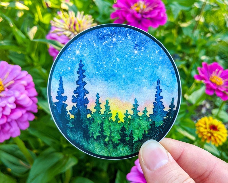 Sunrise Watercolor Painting Forest Sticker (Blue)