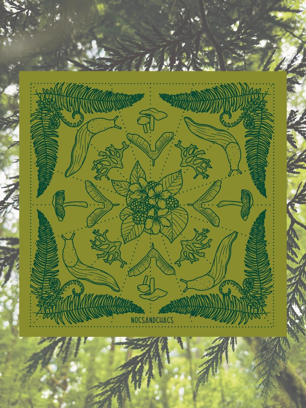 Inspired by some of the most nostalgic beings of the temperate rainforest floor; ferns, banana slugs, mushrooms, lichen, helicopters, and berries.