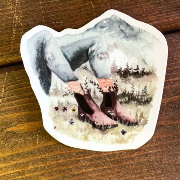 3x3 vinyl die cut sticker of a girl with boots filled with wildflowers. Art by Cedar Watercolors.