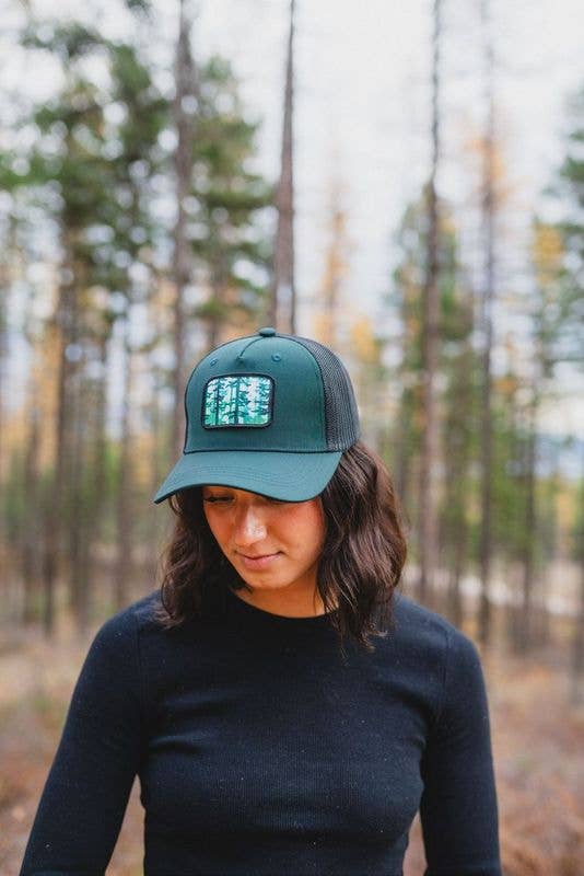 All new watercolor woodland forest patch on a forest colored structured trucker. Snapback closure for a perfect fit.